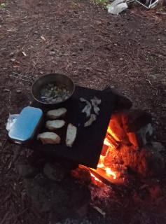 メンバーは最近はまっているらしいアヒージョを。オイラは、火をおこし、溶岩プレートの準備。ロケットコンロにも火を入れて湯を沸かす。湯がわいたところで、溶岩プレートにぶっ掛けて、洗浄。たわしで擦ってから仕上げにもう一度ぶっ掛ければ、焦げや油分が一緒に流されていく。