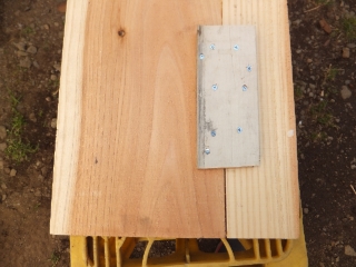 春先、日本蜜蜂の分蜂が始まるとわくわくしちゃうんです。今年こそは!!と気合を入れて早2年 なかなか入居者が決まりません。ま、庭先に置いておくだけだから世話は掛からないんだけどさ。 やっぱ、設置するんだから、ちゃんと入居してもらいたいってのが本音です。 で、今年は、新しい箱を2つ追加するので、ちょちょ〜っと作っちゃいました。 重箱式の日本蜜蜂の巣箱。入居用の3段+増設用の1段を2セット作ってみました。 下段パーツ+中段バーツ(2つ)+上段パーツ+蓋 の1セットを作成する場合 材料:杉野地板(12mm×181mm×1820mm 1枚)、(25mm×181mm×1820mm 2枚)、(25mm×91mm×3000mm 1枚)、 木端(15mm×30mm×50mm 10個)、木棒(10mm×10mm×900mm 2本)、板棒(5mm×25mm×800mm 3本)、 板棒(3mm×25mm×800mm 1本)、35mm×2.0木ねじ(適量)、20mm×2.0木ねじ(適量)、 2mmステンレス針金(300mm×9本)、50mm丁番(2枚)、10mm×2.0木ねじ(適量)、日本蜜蜂蜜蝋(適量)、藁又は模造紙 材料:鋸(手引、丸鋸)、金槌、のみ、ラジオペンチ、針金切り、ガスバーナー、鍋、瓶、刷毛、鉋、3mmドリル 準備工程。カットからはじめます。 @12mm×181mmの野地板を、250mm幅で3枚切り、内1枚を幅70mmと110mmで縦に切りわける。(屋根と床用ね) A25mm×181mmの野地板を、250mm幅で6枚と200mm1枚を罫書いて切りわける。(下段・中段の側面用ね) B25mm×181mmの野地板を、200mm幅で5枚罫書いて切り分ける。(下段・中段の側面用ね) C25mm×91mmの野地板を、250mm幅2枚、200mm2枚の計4枚を罫書いて切り分ける。(上段の側面用っす) D25mm×181mm×200mmの板1枚の底面を両側より50mmの位置に手鋸で8mmの深さまで切り込みを入れ、 切り込みの深さにあわせて、のみで中央部を削り、凹状にする。 (バリ等出ないようにカッターとかで仕上げてもよいかも) E10mm×10mmの木棒を、250mm幅2本、240mm2本の計4本を罫書いて切り分ける。(蓋の側面用っす) F5mm×25mmの棒板を、220mm幅で6本分罫書いて、切り分ける。(蓋内側のスノコ用だよ) G3mm×25mmの棒板を、220mm幅で2本分罫書いて、切り分ける。(蓋内側のスノコ用だよ) 組立工程。 先ずはスノコを作成 12mm、25mm、9mm、25mm、9mm、25mm、10mm、25mm、9mm、25mm、9mm、25mm、12mm A準備Fの部材6本については、両端50mmに罫書きを入れる。 BAの6本を縦に並行に並べておき、@の2本を横棒として置てみる。この時、Aでけがいた50mmを開けた 状態でセットする。 C縦の6本は、@で罫書いた25mm幅の位置に合わせる。 D其々を10mmの木ねじで固定し、220mm四方のスノコにする。 次に蓋を作成 @12mm×181mm×250mmを1枚、12mm×70mm×250mm1枚、 10mm×10mm×250mm2本、10mm×10mm×240mm2本を用意 A2枚の板を合わせ、250mm四方にし、切れ目のある側面上部左右に 10mm×10mm×250mm2本配置して、20mmの木ねじで固定する。 B更に10mm×10mm×240mmの2本を、固定していない側の側面上部に あわせて20mmの木ねじで固定すると、深さ10mmの箱状になる。 C箱の上面中央辺りに15mm×30mm×50mmの木端を1つ配置し、 20mmの木ねじで固定する。 D中央両サイドに3mmのドリルで穿孔をしておく。蓋固定用のネジ穴ね。 次に中段バーツを作成 @25mm×181mm×250mmを2枚と、25mm×181mm×200mmを 2枚で、250mm四方の中空箱を作成する。(35mm木ねじで固定) ・・・片側3本で固定すれば十分かと。 A200mm板側面の右上端より、左125mm、下80mmの 位置に罫書きをいれ、3mmのドリルで穿孔する。 B250mm板側面の右上端より、左75mm、下80mmと、 左175mm、下80mmの位置に其々罫書きを入れ、3mmのドリルで穿孔する。 Cこのじてんで各対面で同じ位置に3mmの穴が開いている。 Dステン針金を端をレジオペンチでUの字に曲げ、 どこかの面の穴に挿し、反対面の穴から外まで貫通させる。 E根本まで挿すとU字側が側面に引っかかるので、 金槌で叩きこむ。(釘のように刺さるよん。) F反対側もラジオペンチで端を曲げ加工して、トンカチで 打ち込むと、箱の中側に針金が張られる。 G残りの穴についても同様に針金を通すと、3本の針金が 格子を組む形で張られる。これは、巣落ち防止用の針金となる。 次に上段パーツを作成 @利用する板が25mm×91mmとなる以外は基本的に中段パーツと作り方は変らない。あと穿孔位置について、 横は変わらないが、高さは、板の半分位置でよいかと。 ※なぜ上段バーツの高さが低いかというと、初年に採取する蜜の量を制限するためとなっている。 最後に下段パーツを作成 @12mm×181mm×250mmを1枚、12mm×110mm×250mm1枚、25mm×181mm×250mmを2枚と、25mm×181mm× 200mmを2枚で 内1枚は凹状に加工した板を利用する。 A12mm×181mm×250mmの板の181mm側の両端にそって25mm×181mm×250mmを直角にコの字になるように接合する。 B床板の不足部分に12mm×110mm×250mmの板を付け足して接続する。 C25mm×181mm×200mm(凹)を下面して、側板にあわせて底面、側面共にネジ止めする。 (この時点で、前面床が40mm程飛び出している) D25mm×181mm×200mm背面用の板をあわせてみる。左右、上下とも、若干の余裕ができるように鉋で削る。 F背面右面にちょっと外に出っ張るように、15mm×30mm×50mmの木端を付ける。(取手とストッパーね) 仕上げ工程 @各パーツについて、表裏上下満遍なく バーナー