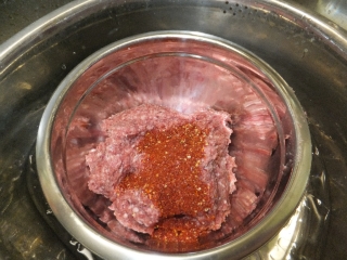 狩猟シーズンをすぎるまでに、結構な勢いで獣肉をおすそわけ頂き、気がつけばそこそこの量が備蓄 されているのだけど、精肉時に発生する端肉や、そのままでは固いすね肉、すじ肉等はひとかたまりにして 冷凍していって、そいつらがまとまった量になると美味しく食べるためにソーセージに加工するって 寸法。素材はイノシシと鹿のスネ肉や端肉。焼いて食べるとありえないほど固くて笑えてくるぐらいだし。 のわりに、噛み締めるほどに良い味が出てくるわけだからソーセージには丁度良いのかなってことで。 今回は、羊腸のケーシングを利用するから、ウインナーって部類になるのか。本当は、鹿の腸を使いたかった のだけど、今期、鹿の内蔵は貰えなかったので。。。 ウインナーソーセージ1,500g 材料:イノシシ肉(スネ・ロース600g、バラ500g)、鹿肉(スネ400g)、岩塩(20g)、冷水(100ml)、 羊腸ケーシング(6m)、牛乳(1,000ml)、氷水(1,000ml)、塩(100g) セージ・ナツメグ・カルダモン・コリアンダー・粒胡椒・乾姜・生ニンニク・生姜・唐辛子(各7g) 道具:ミートミンサー、ボール(大、中)、鍋、脱水シート(1枚)、ゼムクリップ、スモーカー、温度計、 スモークウッド(ヒッコリー12h分)、食品加工用手袋、ミル(細めに設定)、まち針 @ジビエ系の肉(猪、鹿)は、前日より24h程牛乳に浸け、冷蔵保存しておく。 A牛乳から肉をあげ、軽く洗ってから水気を拭き取ったうえで、 脱水シートにくるみ冷蔵庫で1時間程脱水する。 B脱水中に、各香辛料をミルで挽いておく。 唐辛子とニンニクは、別容器に取り分けておく。 ※香辛料を挽く順番が大事。ミルでは最後から 2番めに唐辛子、最後に乾姜を挽くようにする。 ※生は、生姜をおろしてから、ニンニクをおろすと良い。 C用意した全ての肉を粗挽きミートミンサーにてひき肉 にしていく。(室温は低めに。家では10度以下にしている) D全てのひき肉、岩塩、冷水、香辛料(ニンニク・唐辛子以外)を中ボールに入れる。 E大ボールに氷水と塩を入れて混ぜておく。又、ケーシングをため水に入れておく(30分程度) F大ボールの氷水に具材を入れた中ボールを浮かべ、冷却しながら、 粘りが出てくる(エマルジョン化する)までこねくり混ぜる。(調理用手袋をすること。) ※この状態で具材を2等分し、片方に唐辛子とニンニクを入れて 更にこねくり混ぜる(チョリソも作っちゃう) Gエマルジョン化したら、上から圧をかけて、具材に混ざっている 内部の空気を抜いた上で、ラップをかけてボールごと冷蔵庫に 30分程度寝かせる。(一晩ぐらい寝かしても良いらしい) Hふやかしたケーシングを絞り出しノズルにセットしていく。。。 コンダムさんもこの時に閃いたんだろうな。。。 I絞り器にノズルをセットし、具材を入れたらケーシングに向けて ゆっくり絞りだす。具材が出てきたら、先端を糸で縛る。(空気が入らないように。) Jちょっと強めに、でもケーシングの強度を意識しながら内圧をギリギリに ずず〜んと、絞りだして、1本の長いソーセージにしていく。 ※できてきた腸詰は、いったん受け皿に渦巻状に置いていくとよい。 この時、気泡の混入を発見したら、まち針を刺して空気を抜いておく。 K最後に末端を糸でしばり完全な1本ソーセージにしたら、 小分けソーセージに加工していく。 Lソーセージの真ん中を2回転ほど捻じり2本にする。 M捻った端から70mm位先を2本同時に2回転程捻る。 Nこのままでは、先の工程で捻りが解けてしまうので、どちらか片側の1本を、 形成されたソーセージの間をくぐらせる。 これで捻じりが解けることはなくなる。 なんて言うか、バルーンアートみたいで楽しい。。。 Oこの要領で、順にねじり上げていけば、 鎖状の生ソーセージが出来上がる。 ので1時間程風乾する。 Pできるだけ大きな鍋に70度のお湯を用意し、 ソーセージを静かに入れる。当然湯温が下がるので、 65度になるまで加熱し、65度をキープさせたままで 20分ボイルする。(温度と時間はきっちり管理すること) Qボイルが終わったら、粗熱をとって好みの時間 冷蔵庫などで表面を乾燥させる。 R燻製器にぶら下げて、60度以下で60分〜120分程燻 した後常温まで放置して完成です。 (一晩程冷蔵保存するとより安定して美味しくなるよー) 早速喰らってみたら、なんてぇか、ちょっとぼそぼそ。。。脂分が少なかったかな。あとは、挽加減が細かすぎた。 バラを300g、背脂200gとして、こいつらは粗みじんにする程度がよいかも。 あとは、味だな。普通に美味しいけど、塩は、1.5倍入ってもいいかな。チョリソ分は、唐辛子を倍量いれる必要が あるかも。。。 今回は、6m程作ったので、当分ウインナーソーセージには困らないかな。 今後の課題は、ケーシングの自作。。。購入すると高いので、満足感が半減しちゃうんだよね。 |
